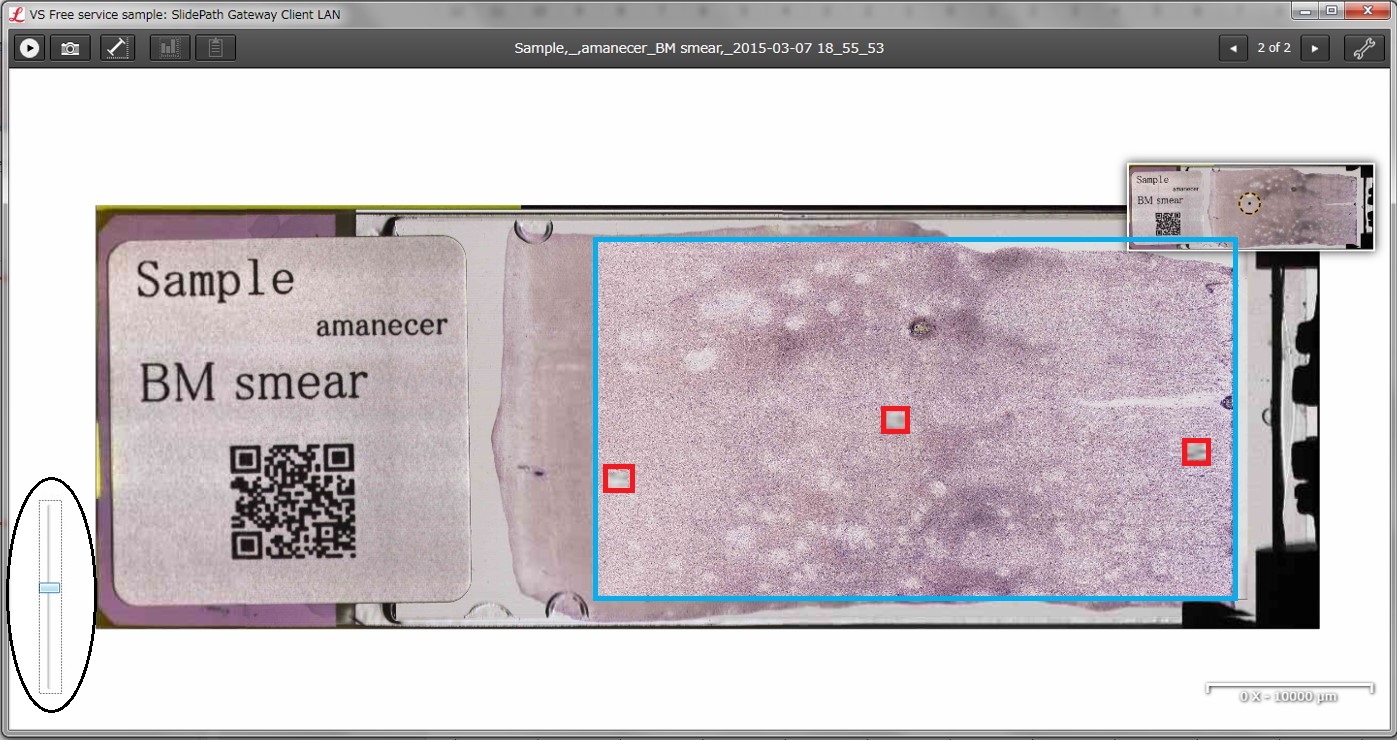 操作画面左下のスライダーを動かすことで、20層のスキャンデータのうち観察したい層のデータを観察できます。スライダーが中央にある時がエリア最適焦点深度としてスキャンされた層で、スライダーをひとつ動かす毎に上下それぞれに1um分焦点深度がずれた層となります。細胞塊がある塗抹で複数の焦点深度を持つ場合に有効なスキャンデータとなります。