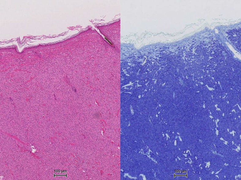右の画像は、同一検体のHE染色標本とトルイジンブルー染色標本を同期観察し、キャプチャしたものです。